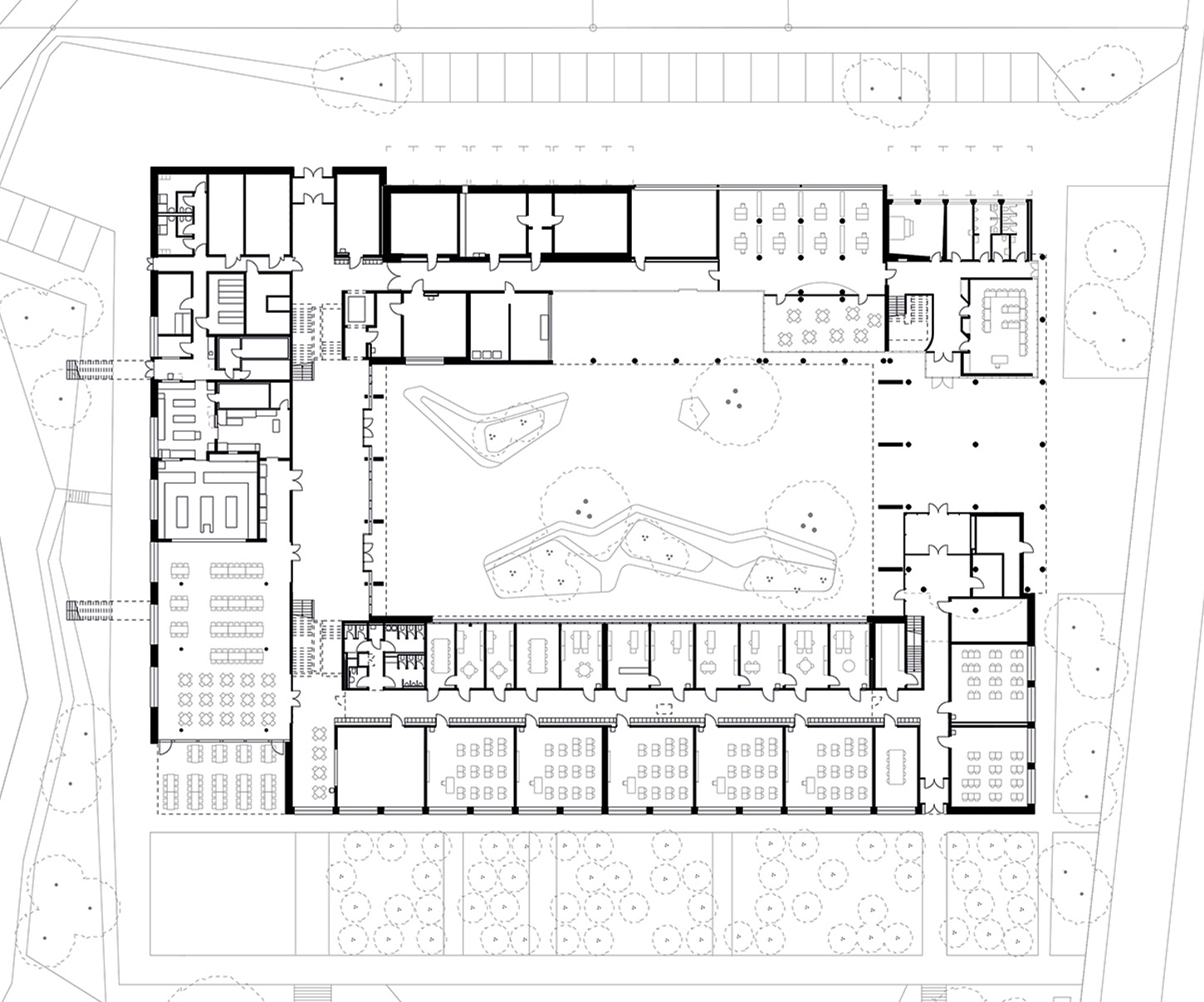 Nach dem Rückbau bis auf den Nord- und Osttrakt formuliert die Ergänzung zusammen mit den bestehenden Bauteilen eine Gesamtanlage um einen zentralen, identitätsstiftenden Hof. Die auch für den Abendbetrieb nutzbaren Allgemeinräume der Schule, Mensa und Aula, werden im neuen Westtrakt zusammengefasst. Die gegen Süden hin ausgerichtete Mensa bietet attraktive Sitzmöglichkeiten im Freien. Die naturwissenschaftlichen Unterrichtsräume im bestehenden Nordtrakt werden mit zusätzlichen Räumen im unmittelbar angrenzenden Westtrakt ergänzt. Im neuen Südtrakt befinden sich Klassenzimmer und die Verwaltung mit dem Lehrerbereich. Durchgehende Erschliessungskorridore bieten in den Obergeschossen kurze Verbindungswege, einen optimalen Betrieb und eröffnen immer wieder den Blick nach Aussen. In diesen erweiterten Korridorzonen befinden sich jeweils die einladenden Aufenthaltsbereiche. Der Nord- und Osttrakt werden weiter betrieben, die Eingriffe werden auf das absolut Notwendige beschränkt.